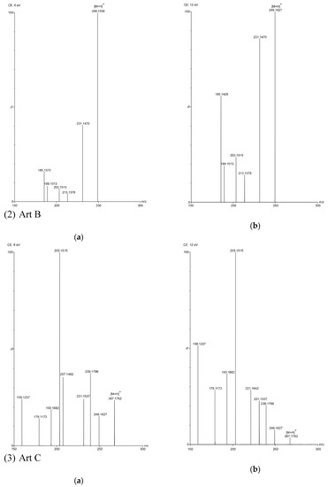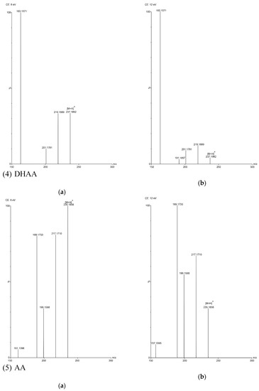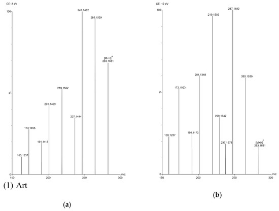 TOF MS total ion current spectra of the five compounds in two fragmentation energies. (1) Art, m/z = 283.1534; (2) Art B, m/z = 249.1490; (3) Art C, m/z = 267.1619; (4) DHAA, m/z = 237.1847; (5) AA, m/z = 235.1724. a: The lower fragmentation energy (8 V); b: The higher fragmentation energy (12 V).