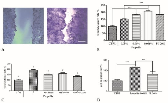 Cells exposed to propolis showed a significantly higher wound closure rate with respect to the control. The strongest effect was observed with 0.001% of propolis, more pronounced from that induced by PL (Figure 1A,B).