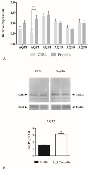 Aquaporins (AQPs) are integral membrane proteins; they act as channels in the water transfer across the plasma membrane, playing a central role in skin hydration [8,9]. Therefore, we decided to quantify the basal expression of some AQPs and the variation after propolis exposure, by means of qPCR data.