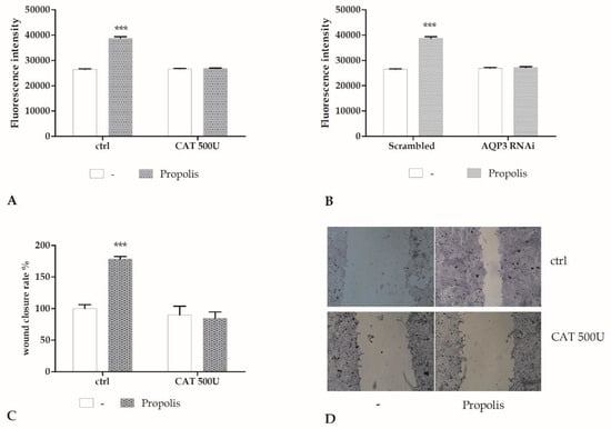 The role of H2O2 released by propolis exposure is supported by the inhibition in a dose-dependent manner by CAT, an H2O2 scavenger. The use of generic fluorescent H2O2 indicator, such as DHR-123, revealed ROS production within the cytoplasm. Genetic silencing of AQP3 with a selective RNAi prevented the increase in intracellular ROS levels and abrogated the wound closure response to propolis. These data, therefore, strongly suggested that AQP3 mediated H2O2 entry into the cytoplasm.