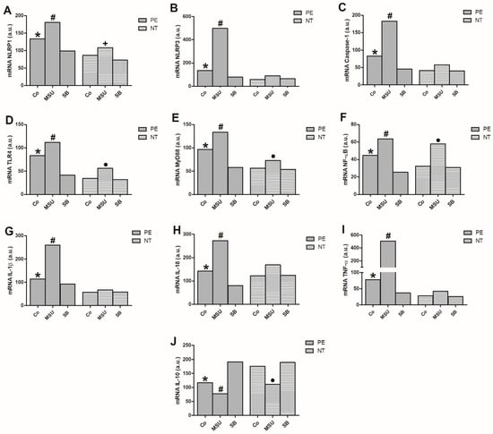 Gene expression of NLRP1 (A), NLRP3 (B), Caspase-1 (C), TLR4 (D), MyD88 (E), NF-κB (F), IL-1β (G), IL-18 (H), TNF-α (I) and IL-10 (J) in monocytes from 20 pregnant women with preeclampsia (PE) and 20 NT pregnant women, cultured in the absence (Co) or presence of MSU or SB. Results are expressed as the median in arbitrary units (a.u.). * p < 0.05 vs. NT Co, PE SB; # p < 0.05 vs. PE Co, PE SB; + p < 0.05 vs. NT SB; • p < 0.05 vs. NT Co, NT SB (Kruskal-Wallis test).