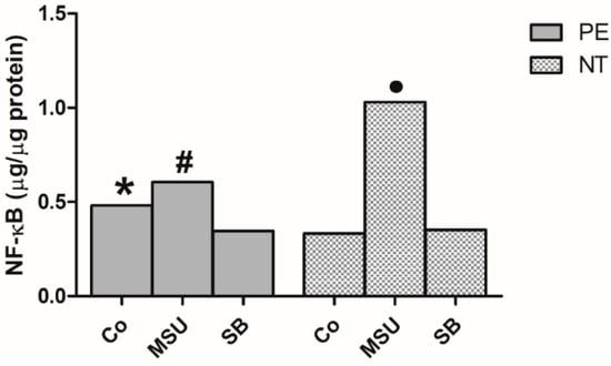NF-κB concentration in nuclear extracts of monocytes from 20 pregnant women with preeclampsia (PE) and 20 NT pregnant women, cultured in the absence (Co) or presence of MSU or SB. Results are expressed as the median. * p < 0.05 vs. NT Co, PE SB; # p < 0.05 vs. PE Co, PE SB; • p < 0.05 vs. NT Co, NT SB (Kruskal-Wallis test).