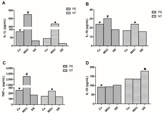 IL-1β (A), IL-18 (B), TNF-α (C) and IL-10 (D) production by monocytes. Monocytes from pregnant women with preeclampsia (PE) and NT pregnant women were cultured in the absence (Co) or presence of MSU or SB. Results are shown as the median. * p < 0.05 vs. NT Co, PE SB; # p < 0.05 vs. PE Co, PE SB; • p < 0.05 vs. NT Co, NT SB; ■ p < 0.05 vs. NT Co, NT MSU (Kruskal-Wallis test).