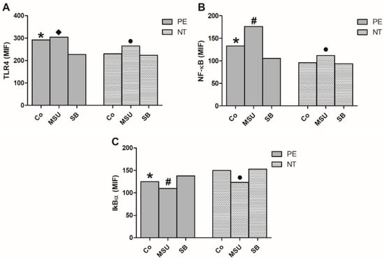 Flow cytometric analysis showed that monocytes from pregnant women with PE presented higher endogenous expression of TLR4 and NF-κB and lower expression of IκBα when compared to NT pregnant women (Figure 4). Monocyte culture of preeclamptic women with MSU did not increase TLR4 expression by these cells. However, treatment with SB decreased its level (Figure 4A). Regarding the group of NT pregnant women, monocytes cultured in the presence of MSU showed higher TLR4 and NF-κB expression in relation to control (Co) and SB-treated cultures (Figure 4A,B). The protein level expression of NF-κB increased due to the addition of MSU in the culture of monocytes from pregnant women with PE, whereas treatment with SB decreased these levels (Figure 4B). Monocytes from preeclamptic and NT pregmant women, cultured in the presence of MSU, had decreased IκBα expression, while SB treatment caused an increase in this factor. (Figure 4C).