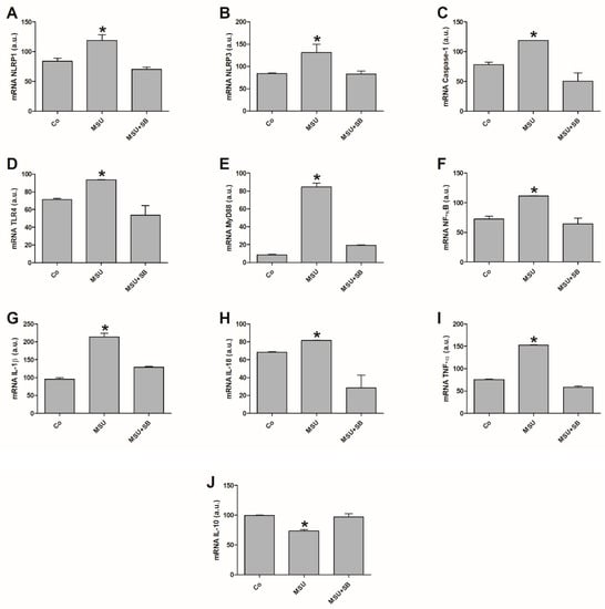 Gene expression of NLRP1 (A), NLRP3 (B), Caspase-1 (C), TLR4 (D), MyD88 (E), NF-κB (F), IL-1β (G), IL-18 (H), TNF-α (I) and IL-10 (J) in THP-1 cells cultured in the absence (Co) or presence of MSU or SB. Results, obtained from five independent experiments, are shown as mean ± standard deviation (SD) in arbitrary units (a.u.). * p < 0.05 vs. Co and MSU + SB (ANOVA).