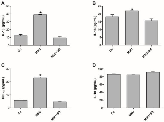 THP-1 cells stimulated with MSU produced increased concentrations of IL-1β, IL-18 and TNF-α when compared to the control and MSU + SB-treated cultures. There were no significant diferences between THP-1 cultures with regards to IL-10 production (Figure 6).