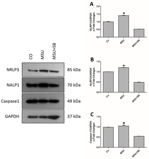 NLRP1 (A), NLRP3 (B) and Caspase-1 (C) protein expression by THP-1 cells cultured in the absence (Co) or presence of MSU or silibinin (SB). Results, obtained from five independent experiments, are shown as mean ± SD in arbitrary units (a.u.). * p < 0.05 vs. Co, MSU + SB; # p < 0.05 vs. MSU + SB (ANOVA).