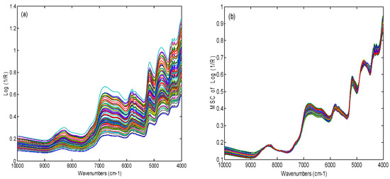 Spectra of Trichosanthis Fructus (a) raw data and (b) with multiplicative scatter correction (MSC) pretreatment.