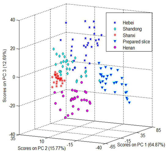 Score cluster plot of the top three principal components (PCs) of Trichosanthis Fructus for the data set.