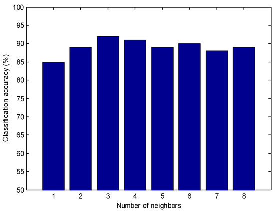 The KNN method was based on the Euclidean distance between neighbors. Parameter K, the number of neighbors which significantly influenced the model performance, could be determined by the classification accuracy (%) for each class. The prediction ability of the model for a given set of K values was evaluated by cross-validation, and the K value which gave the highest prediction rate was selected as the optimal one. Figure 3 showed the classification accuracy of the KNN model according to different K values. The optimal K value gave the highest classification accuracy by cross-validation. As shown in Figure 3, eight K values (K = 1, 2, …, 8) were tested simultaneously for building model and the optimal KNN model was obtained when K = 3. The classification accuracy was 92% in the calibration set and 94% in the prediction set, respectively.