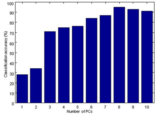 Classification accuracy of the partial least squares-discriminant analysis (PLS-DA) model according to different number of PCs.