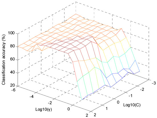 Classification accuracy of the support vector machine-discriminant analysis (SVM-DA) model according to different Log10 (γ) and Log10 (C) values.