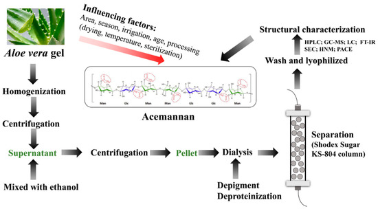 Acemannan, found in internal leaf aloe gel, is a polysaccharide composed of β-(1,4)-linked highly acetylated mannoses, β-(1,4)-linked glucose and α-(1,6)-linked galactose [21,31]. Since the bioactive components of aloe including acemannan always have considerably different exaction methods (Table 1). The separation process is shown in Figure 1, where the molecular structure is taken from [32].