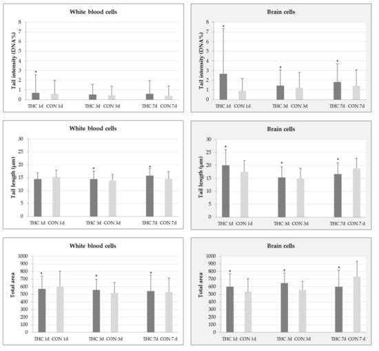 Since the present study was a pioneer in the assessment of potential THC genotoxicity on rodent white blood and brain cells using the comet assay, it is not possible to draw a parallel between our findings and other literature sources. We can only mention the conclusions of our previous comet assay study where the same THC dose was used [20]. They suggest that continuous 7-day oral exposure of rats to THC caused low-level DNA damage in liver cells.