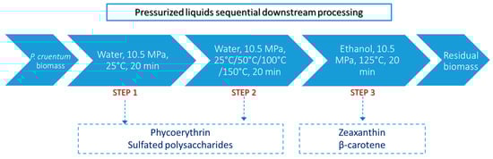 Considering the particular chemical composition of P. cruentum, other compounds, such as proteins and polysaccharides, can also be employed as high added-value products. In this sense, a sequential process was designed taking into account the possibility of extracting phycoerythrin and sulfated exopolysaccharides, together with carotenoids. Although at first sight, the previously optimized PLE conditions for carotenoids could be employed for phycoerythrin extraction, given the thermal lability of phycoerythrin and the need for its recovery as intact phycobiliprotein, a process starting at a lower temperature would be the most appropriate. Thus, the sequential process should unavoidably start with the extraction of phycoerythrin and sulfated polysaccharides and then, finalizing with the extraction of carotenoids. Considering these aspects, the sequential extraction process proposed consisted of three different extraction steps. Its scheme is presented in Figure 1.