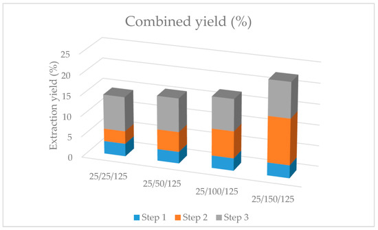 Accumulated extraction yields produced in each sequential processing alternative at the indicated extraction temperatures (°C, step 1/step 2/step 3).