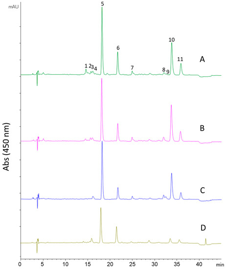 Chromatograms obtained by high-performance liquid chromatography (450 nm) for the extracts obtained in step 3 using ethanol at 125 °C after the extraction in step 2 at (A) 25, (B) 50, (C) 100, and (D) 150 °C. For peak assignment, see Table 4.