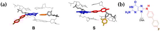 (a) Two major conformational views of dG-C8-FABP [N-(2′-deoxyguanosin-8-yl)-4′-fluoro-4-aminobiphenyl]: B-, and S-conformers. Fluorine-labeled ABP (FABP)-red, modified dG-blue, complementary C-orange. (b) The chemical structure of dG-C8-FABP.