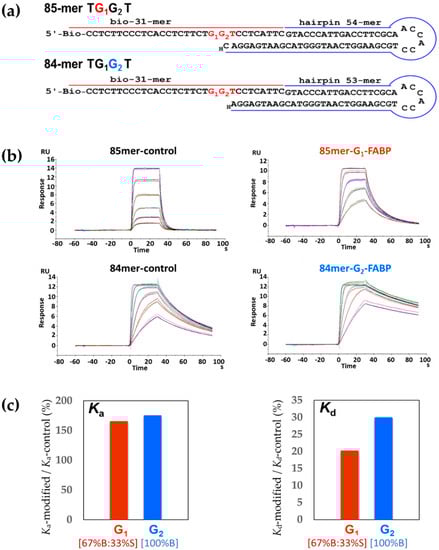 The 84- and 85-mer biotinylated oligonucleotides were purified and identified by 15% denaturing polyacrylamide gel (Bio-rad, Hercules, CA, USA) [27]. Figure S2 reveals the denaturing gel profiles of unmodified/modified 84- and 85-mer ligated oligonucleotides, biotin–31-mer, and 53-mer/54-mer non-ligated oligonucleotides. For the 85-mer control, all the biotin–31-mer and 54-mer hairpins were ligated. As for the 84-mer control, 85-mer G1*, and 84-mer G2*, excessive biotin–31-mer, 54-mer, and 53-mer were observed correspondingly. The ligated and purified 85-mer control/ G1* and 84-mer control/ G2* were used for SPR experiments.