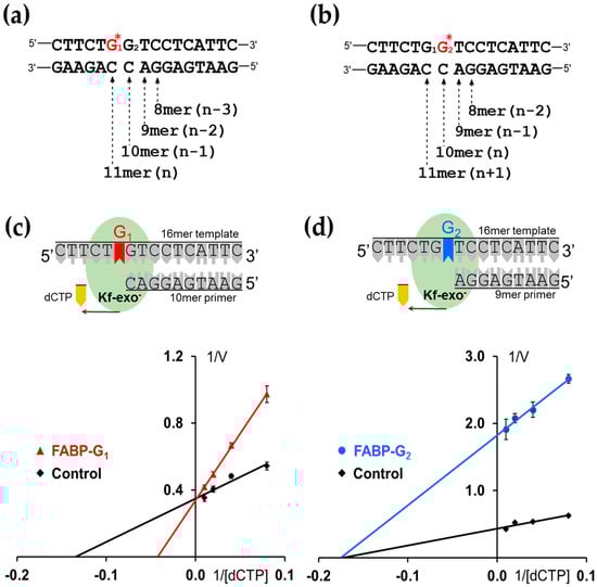 DNA replication models for (a) FABP-modified G1* (TG*GT) templates and (b) FABP-modified G2* (TGG*T) templates. n: lesion site. Lineweaver–Burk model of DNA synthesis catalyzed by Kf-exo− at (c) 10-mer, G1-FABP and (d) 9-mer G2-FABP lesion sites with dCTP at steady-state. The G1-FABP against with Kf–exo– adopts a competitive inhibitor model, whereas the behavior of TG1G2*T shows as non-competitive (see text).