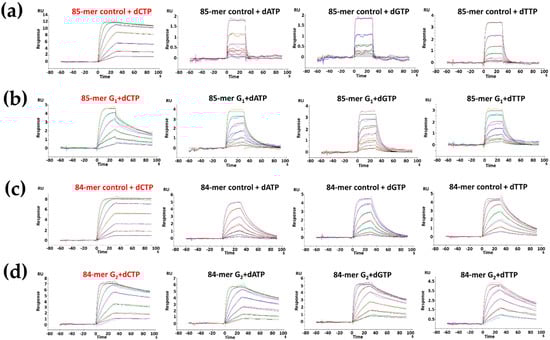 Sensorgrams of the ternary Kf-exo− complexed with (a) 85-mer control, (b) 85-mer TG1[FABP]G2T, (c) 84-mer control and (d) 84-mer TG1G2[FABP]T sequences in the presence of dNTPs (1:1 binding fitted curves are overlaid as black lines).