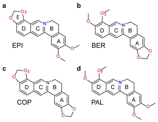 Chemical structures of protoberberine alkaloids: (a) epiberberine (EPI), (b) berberine (BER), (c) coptisine (COP) and (d) palmatine (PAL).