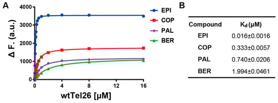 (A) Fluorescence intensity of four protoberberines (0.2 μM) upon titration with wtTel26 DNA, showing 1:1 binding by the curve fitting (solid line). Conditions: 25 °C, pH 7, 100 mM K+. (B) The determined disassociation constant (Kd) values of the EPI, COP, PAL, BER.