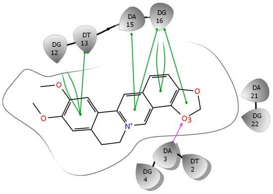 The ligand interaction diagram based on the NMR structure of the EPI-wtTel26 complex. The green lines represent stacking, and purple arrow indicates H-bonding interaction.