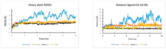 The MD simulated time courses of (left) the RMS deviation from the starting structures of the complex and (right) the ligand:O3-A3:N6 distance in the complexes of the four ligands bound to the wtTel26 G4.