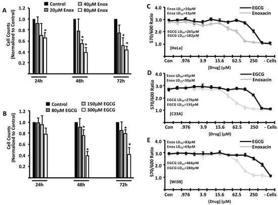 Effects of enoxacin and EGCG on cervical cancer cells in culture. HeLa cells were treated with a time course of varying doses of enoxacin (A) or EGCG (B) then counted to analyze cell numbers. Cell counts are presented relative to control (DMSO)-treated cells. HeLa (C), C33A (D) and WI-38 (E) cells were treated with serially-diluted concentrations of drug for 48 h and viability determined via the reduction of alamarBlue. (- cells) denotes alamarBlue reduction in the absence of plated cells. Data are representative of three independent experiments. LD50 values are denoted in each respective figure. * p < 0.05.
