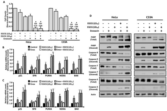 EGCG functions synergistically with enoxacin. Cells were treated as indicated and counted at 48 h (A). For analysis of synergism, the coefficient of drug interaction (CDI) is listed in (A) for co-treatments. Real-time PCR was used to examine gene expression of cell cycle-arrest and apoptotic genes in HeLa (B) and C33A (C) cells following the indicated treatments. All data are normalized to control-treated cells and are shown +/− standard deviation. * p < 0.05 relative to control-treated cells. ** p < 0.01, relative to control-treated cells. To analyze protein markers of apoptosis, cells were treated and Western blot was used to measure the levels of apoptosis-related proteins (D). All data are representative of three independent experiments.
