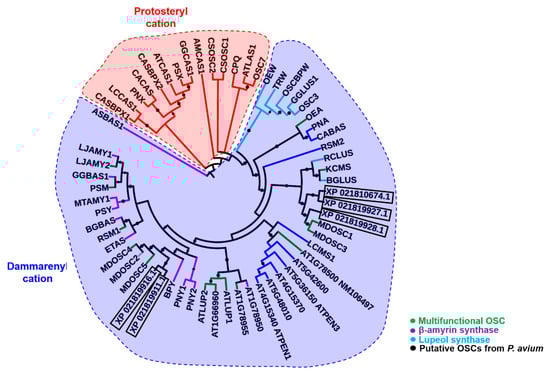 Alignment of the P. avium putative OSCs with those from apple revealed the presence of the conserved sequence QX3GXW, together with the substrate-binding motif DCTAE [,,,] (Figure S1). The maximum likelihood phylogenetic analysis shows that the P. avium putative OSCs XP_021819911.1 and XP_021819916.1 branch together with the cluster formed by monofunctional β-amyrin synthases (indicated in violet) and the multifunctional apple MdOSC4 (Malus domestica oxidosqualene cyclase) and 5 (indicated in green) (Figure 1). The putative OSCs XP_021810674.1, XP_021819927.1 and XP_021819928.1 cluster instead in the clade formed by multifunctional OSCs and lupeol synthases (Figure 1). From the phylogenetic analysis, we can speculate that the identified OSCs belong to the multifunctional type, given their stricter clustering with apple multifunctional orthologs.