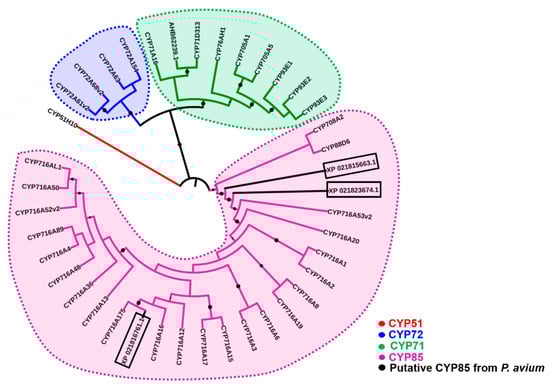 The phylogenetic analysis of the putative sweet cherry CYPs shows their clustering in the clade composed by CYP85s (Figure 2). XP_021816761.1 clusters together with the recently characterized apple CYP716A175 [] and is therefore the closest, in terms of sequence, among the three CYP85s found in sweet cherry.