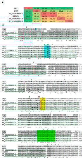 Minor changes in amino acids have been implicated in major changes in the type of products formed by OSCs []. For example, Trp within MWCYCR motif (as in XP_021819911.1) has been linked to β-amyrin specificity, whereas Leu (as in XP_021819927.1) and Phe (in XP_021819928.1 and MdOSC1) at this position are implicated in lupeol synthesis [] (Figure 3B). Similarly, Lys residue (K449 in XP_021819911.1, K452 in XP_021819927.1) have been implicated in α/β-amyrin specificity, whereas Ala, Asn or Ile (I448 in XP_021819928.1 and MdOSC1) have been proposed to be involved in lupeol activity []. The mutation of Ser or Thr (equivalent to S699 in human) to Phe in plants has been shown to convert OSC to make tetracyclic rather than pentacyclic products []. However, these rules are not unambiguous, as all fruit OSCs are supposed to be amyrin producers based on Lys and Ile residues, but should be lupeol synthases based on MFCYCR/ILCYCR motifs in XP_021819927.1, XP_021819928.1 and MdOSC1. This implies that these fruit enzymes are either multifunctional OSCs (as the phylogenetic analysis shown before would suggest, Figure 1), or other residues may be involved in the product specificity [,]. It is noteworthy that MdOSC1, which shows 95% identity with XP_021819928.1, has been proposed to be a mixed amyrin synthase [], able to produce α-amyrin, β-amyrin and lupeol with a ratio 85:13:2 [].