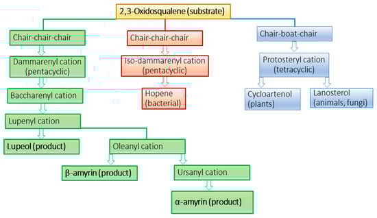 - Salmon, M.; Thimmappa, R.B.; Minto, R.E.; Melton, R.E.; Hughes, R.K.; O’Maille, P.E.; Hemmings, A.M.; Osbourn, A. A conserved amino acid residue critical for product and substrate specificity in plant triterpene synthases. Proc. Natl. Acad. Sci. USA 2016, 113, E4407–E4414. [Google Scholar] [CrossRef] [PubMed]