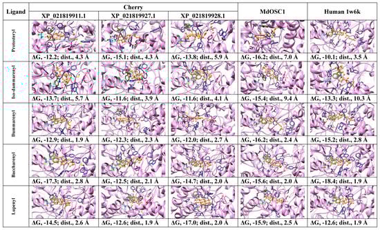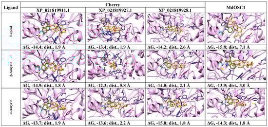 In order to discriminate between three possible types of products (lupeol, α-amyrin and β-amyrin) formed by the Tuscan sweet cherry OSCs, we subjected fruit OSCs to docking analysis using products (Figure 10) along with lanosterol and human OSC as a control (not shown). While tetracyclic lanosterol binds well to sweet cherry XP_021819911.1 and MdOSC1, the minimum ligand to Asp distance (1.9 Å) was obtained with human OSC (results not shown) implying that lanosterol is the preferred substrate for human enzyme. Lupeol binds to all cherry enzymes with low ligand to Asp distances (1.9–2.6 Å) and high ligand–protein affinities (−13.4 to −14.2 kcal mol−1), compared to apple MdOSC1 that showed larger distance (Figure 10), implying that all cherry OSCs have correct active-site topology to synthesize lupeol. Similarly, Figure 10 shows that all fruit OSCs also have potential to form α-amyrin, as well as β-amyrin, except cherry XP_021819927.1.
