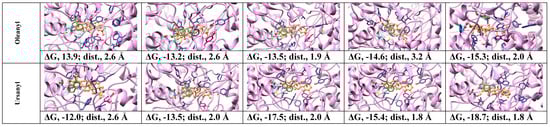 Poses, ligand-OH----OOC-Asp-protein distances and affinities of oxidosqualene cyclases (OSCs) docked with the reaction products from fruit models. ΔG, Gibbs free-energy of binding (kcal mol−1); dist, ligand-OH.…OOC-Asp-protein distances. Ligand, brown; catalytic Asp, cyan; Trp docking reference, green; Tyr/His: magenta. Other active site residues, dark blue; oxygen atoms, red; nitrogen atom, light blue and hydrogens, white.