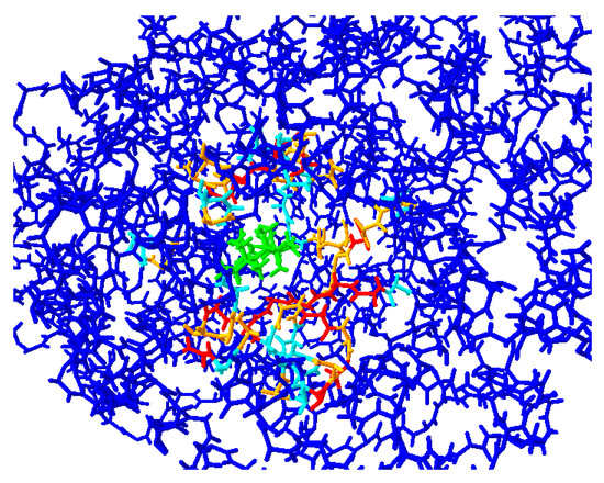 In order to validate that RLD is taking into account the flexibility of the active site during ligand docking, we determined the RMSD of the overall structures and key residues surrounding the catalytic-site. The overall RMSD (spread over the entire protein molecule) of all OSCs docked with cation intermediates and products varied from 0.04–0.076 Å, whereas RMSD of residues away from the active site were close to 0 Å and RMSD of residues surrounding the active site were > 0 Å (results not shown). For example, the RMSD values of the residues surrounding the catalytic site of a representative docked cation-intermediate and a product are given in Table 1, whereas a color representation of cherry XP_021819928.1 docked with dammarenyl cation is shown in Figure 9. The RMSD of residues away from the active site were close to 0 Å (Figure 9), whereas the RMSD values of residues surrounding the catalytic-site varied from 0.102–1.245 Å (Table 1), thereby confirming that backbone conformational changes within the active site took place upon docking.