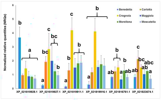 Gene expression analysis of the putative OSCs and CYP85s in the ancient sweet cherry varieties. For linearity with the previous phylogenetic data, the accession numbers of the corresponding proteins are used to identify the OSCs and CYP85s. Error bars indicate standard deviations (n = 4). Different letters indicate statistically significant differences (p < 0.05) calculated with the Tukey’s post-hoc test.