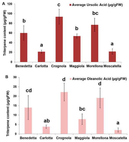 Triterpene composition of the Tuscan sweet cherry fruits. A: ursolic acid content; B: oleanolic acid content. Data are expressed in µg g−1 FW (n = 5, with the exception of ‘Crognola’, where n = 4). Different letters indicate statistically significant differences (p < 0.05) calculated with the Tukey’s post-hoc test.