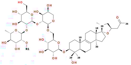 - Challinor, V.L.; de Voss, J.J. Open-chain steroidal glycosides, a diverse class of plant saponins. Nat. Prod. Rep. 2013, 30, 429–454. [Google Scholar] [CrossRef] [PubMed]
