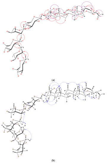 1H-NMR and heteronuclear single quantum coherence (HSQC) spectrum of 12 showed five anomeric signals. Two of them, observed as narrow doublets, were initially assigned to α-L sugars while three wide doublets were key to β-D sugars []. Overlapping 1H signals were resolved by the examination of HSQC and heteronuclear multiple bond correlation (HMBC) together with total correlated spectroscopy (TOCSY) and finally defined by heteronuclear two bond correlation (H2BC). Sugar chain linearity and positions of substitution were confirmed by 2D-NMR as shown in Figure 2a,b. Briefly, anomeric hydrogen of first glucose moiety was HMBC correlated with C3 of the aglycone and HMBC correlation from H3 to C1 of the first glucose was observed. This pointed out the place of substitution of the aglycone with the sugar chain. The C6 signal of the first Glcp was shifted downfield by 6 ppm relative to the non-substituted Glcp. This chemical shift difference suggested Arap was linked to the C6 of the first Glcp. Anomeric hydrogen of the second glucose unit was correlated not only with C2 of arabinose but also with C1 of arabinose. That was the reason the second glucose was linked (1→2) to arabinose. C2 signal of the second glucose was shifted downfield relative to the non-substituted Glcp. That remarked that this sugar was substituted with the next one (rhamnose). HMBC correlations verified that supposition. The observation of highly shifted C2 of Rhap (up to 83 ppm) together with long-range HMBC of an anomeric proton from the third Glcp determined the position of substitution at the end of the sugar chain. The 13C chemical shifts of the glycone part of 12 were strictly similar to those reported in the literature [,,].