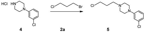In the next stage of our research related to the synthesized trazodone with method II, 1-(3-chlorophenyl)-4-(3-chloropropyl)piperazine (5) was obtained in the reaction of 3-chloroarylpiperazine (4) with 1-bromo-3-chloropropane (2a) (Scheme 5) under microwave radiation.