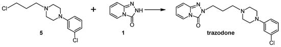 Trazodone was also obtained in a “one-pot” variant. The process was carried under microwave radiation by firstly heating 1,2,4-triazolo[4,3-a]pyridin-3(2H)-one (1) with 1-bromo-3-chloropropane (2a) for 50 s, followed by the addition of 1-(3-chlorophenyl)piperazine (4) for another 90 s. The expected product was obtained with a yield of 31%. The synthesis was also performed in the CEM Discover SP reactor (100 W), carrying out the process for 30 s in the first stage and for 60 s in the second, which allowed obtaining trazodone with a yield of 71%.
