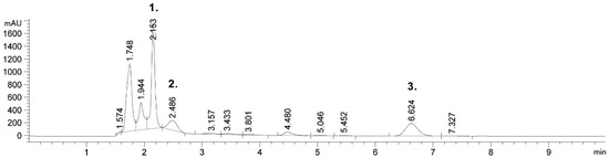 Targeted phenolic compounds and solanesol were identified by HPLC. HPLC is the most common analytical technique for the identification and characterization of phenolic compounds in plant materials. A chromatographic profile of 80% ethanol extract, obtained under the following conditions of 30 min, 30 °C and using 30 mL/g, is presented in Figure 1. As can be seen from Figure 1, six (6) peaks were observed at 210 nm, and three (3) of them were identified. The largest peak was identified as chlorogenic acid (peak 1). The second peak was identified as caffeic acid and the third one was identified as rutin. Targeted compounds were identified by retention times and a UV spectra by comparing them with commercial standards, as well as comparing them with data available in the literature [14,22,37,38]. Moreover, a chromatogram of the obtained extract shows two peaks near to the chlorogenic acid.