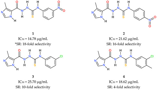Structures of previously reported imidazole-thiosemicarbazides with potent inhibitory activity against the proliferation of Toxoplasma gondii [19]. *SR—selectivity ratio; defined as the ratio of the 50% cytotoxic concentration (CC50) to the 50% antiparasitic concentration (IC50).