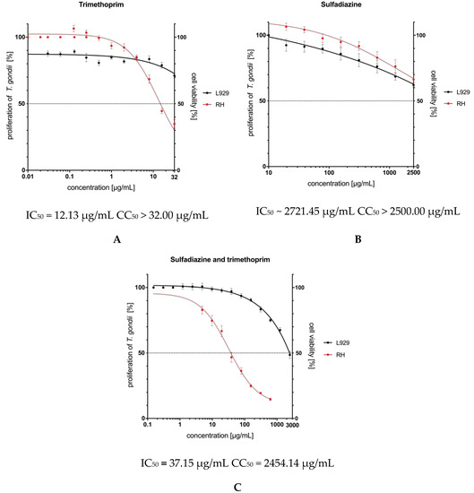 Presentation of the inhibitory concentration (IC50—proliferation of Toxoplasma gondii), cytotoxic concentration (CC50—cell viability) and selectivity ratio of (A) sulfadiazine, (B) trimethoprim and (C) combination of sulfadiazine and trimethoprim (5:1) against Toxoplasma gondii.