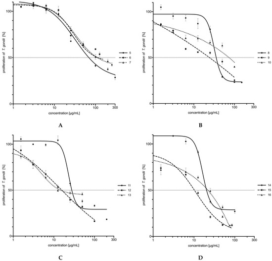Dose response curves and IC50 values [µg/mL] of compounds 5–16, (A) 5–7, (B) 8–10, (C) 11–13, (D) 14–16 on T. gondii proliferation.