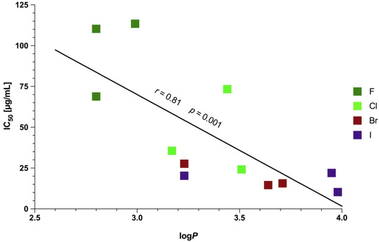 In the light of all the facts mentioned above, for the purpose of the study, the lipophilicity of 5–16 was measured experimentally by the HPLC technique and its correlation with antiparasitic activity was probed. The logP parameters for 5–16 are shown in Table 2. The comparison of the logP and IC50 shows that the general trend in anti-Toxoplasma gondii activity of 5–16 is dependent upon lipophilicity and a significant incremental increase in the partition coefficient resulting from an increase in activity is observed, with the Spearman’s rank correlation coefficient 0.81 and p value 0.001 (Figure 4). In fact, except for 10, the weakest inhibitors in our studies (5–7) are the least lipophilic, while the most lipophilic compound (15) proved to be the best inhibitor of T. gondii growth in vitro. Thus, the results collectively suggest that lipophilicity would be a rate-limiting factor for the anti-Toxoplasma activity of the halogen-substituted imidazole-thiosemicarbazides. From the point of view of rational drug design, other important conclusions from these studies should also be mentioned: (i) fluoro-substituted thiosemicarbazides (5–7) are the least lipophilic followed by the ortho isomers, 8, 14, 11; (ii) lipophilicity of the meta and para isomers increases with halogen size from chlorine to iodine; (iii) para isomers tend to have lower lipophilicity than their meta counterparts (para-chloro < meta-chloro < para-bromo < meta-bromo < para-iodo < meta-iodo).