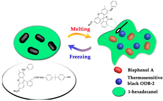 In the present study, 2-anilino-6-dibutylamino-3-methylfluoran (ODB-2) was selected as a color former. 1-hexadecanol (1-HD) and bisphenol A (BPA) served as solvent and developer, respectively. The thermochromic materials were black at room temperature, and when 1-hexadecanol melted into an amorphous state, the color faded. This process caused notable light absorption changes due to the color variation of ODB-2, and the thermal equilibrium under irradiation was achieved at a lower temperature, which was beneficial for increasing the photostability of the light-harvesting molecules under continuous irradiation. The mechanism is as follows: ODB-2, like many other similar chromophores, presents two different isomers: the leuco lactone form, which is colorless, and the open carboxylate state, which is colored. When 1-HD starts to crystalize as temperature decreases, the equilibrium between both isomers of ODB-2 is displaced by interactions with bisphenol A through hydrogen bonding, which favors ring-opening of the color former (Figure 1) [,,,].